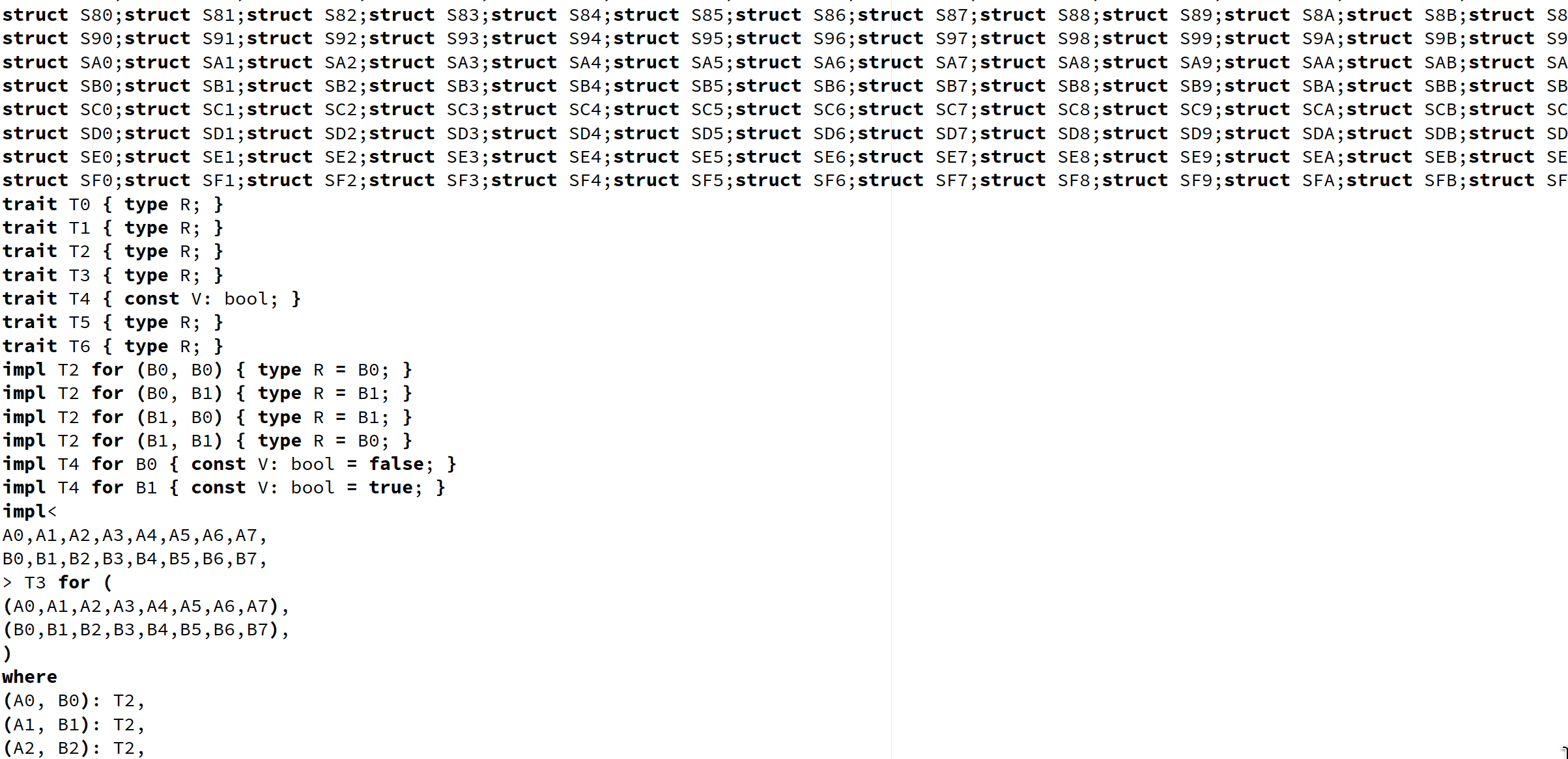 Extending this type of logic to 256 types, representing each possible value of a byte is possible but instantly leads to a hit to compilation performance: every binary operation has 65536 impl blocks. We can sidestep the issue for bitwise operations by defining rules to convert between types representing bytes and types representing bits, for which we need "only" 512 impl blocks: